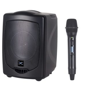 Helix 158x, 150 watt (100 watt RMS) 8″ full range, portable PA system with built-in Bluetooth/SD/USB Player Recorder. With 1 x Wireless Receiver